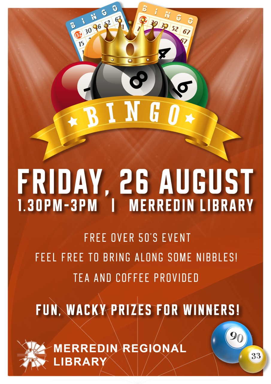 Bingo! Free fun and wacky prizes for the over 50's. Bring along some nibbles and enjoy a free cuppa for an afternoon with others at the Merredin Library Friday 26 August - 1.30-3pm.