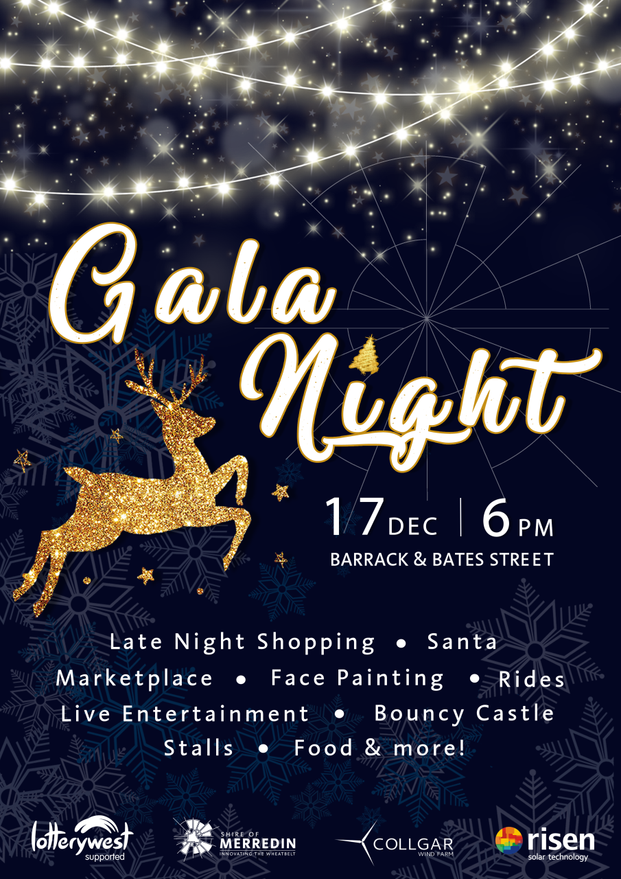 The Shire of Merredin’s annual Gala Night is one of the biggest events on Merredin’s calendar, drawing locals and our surrounding wheatbelt community to celebrate the years end. It is where Merredin comes together to showcase the best of what our businesses and community have to offer as we collectively host a, once a year only, late night shopping experience with fun, food and entertainment for all the family.