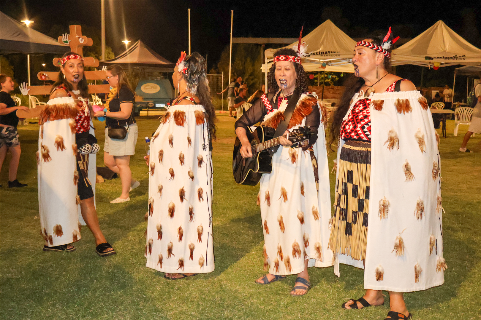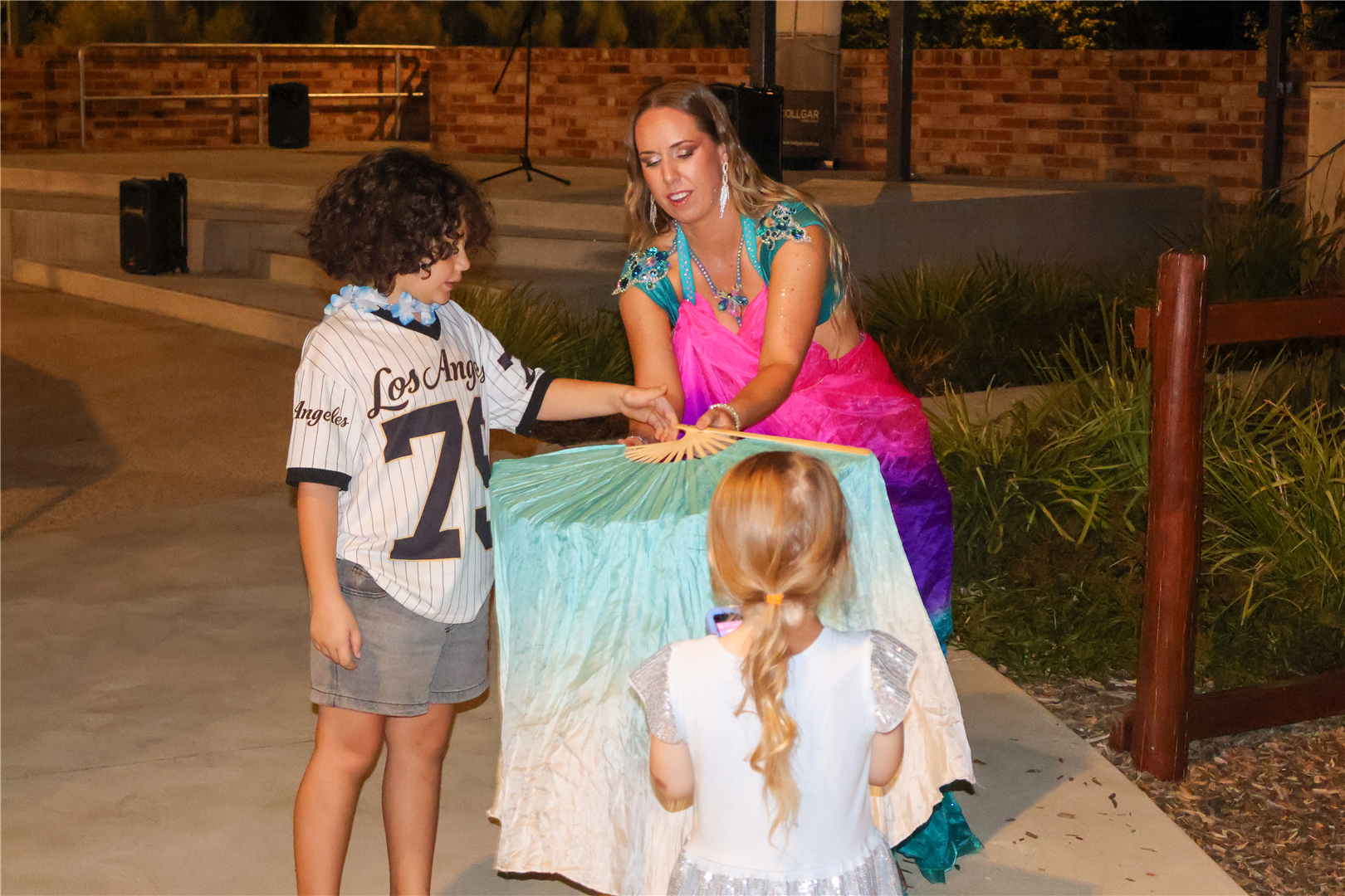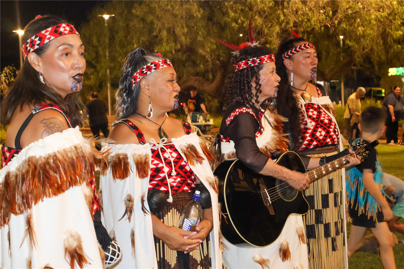 The evening’s entertainment brought colour and energy to the Town Centre, beginning with local children weaving through the crowd in vibrant dragon costumes as they rung hand bells. A captivating belly dancing performance followed, before a poetry reading. The crowd was then invited to experience the spirit of Māori culture, featuring poi demonstrations, the power of a traditional Haka, and beautiful waiata (songs). The evenings entertainment concluded with the belly dancer offering interactive roving performances that invited the crowd to join in. Children, in particular, embraced the opportunity to learn new dance moves and engage with the props.