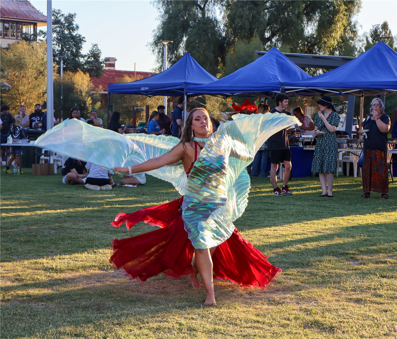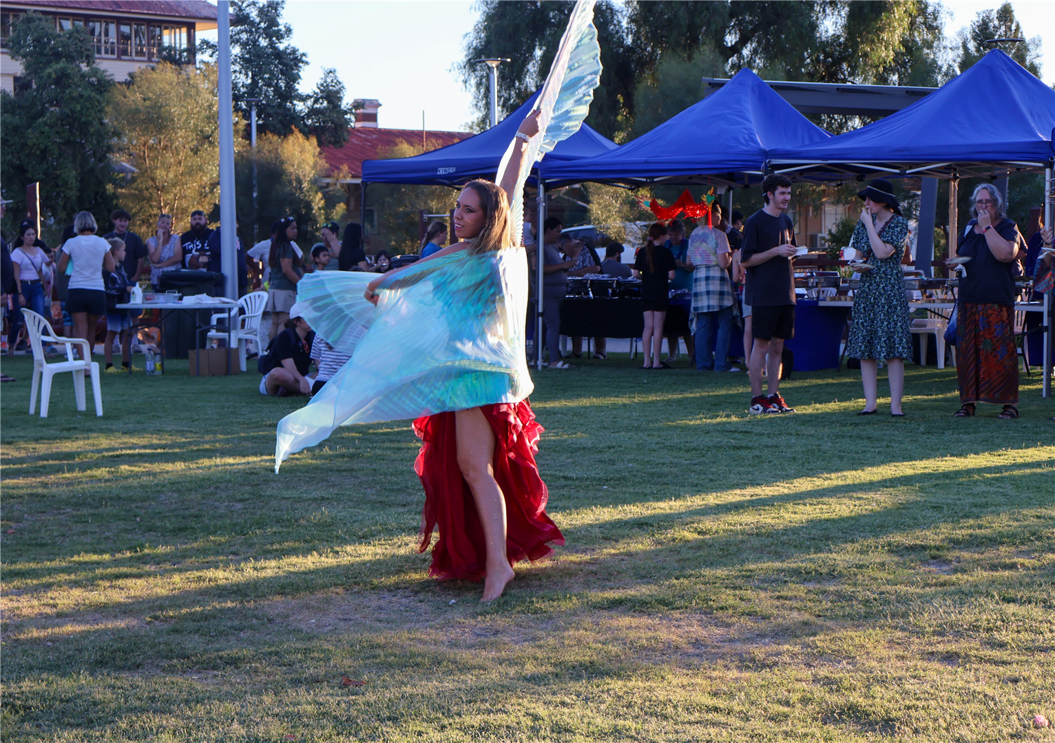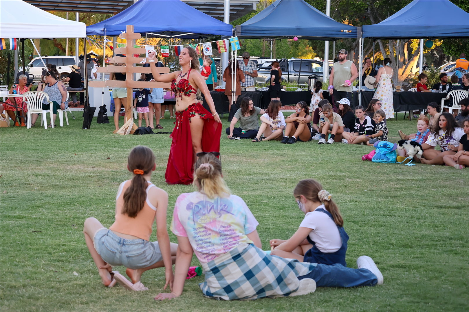 The evening’s entertainment brought colour and energy to the Town Centre, beginning with local children weaving through the crowd in vibrant dragon costumes as they rung hand bells. A captivating belly dancing performance followed, before a poetry reading. The crowd was then invited to experience the spirit of Māori culture, featuring poi demonstrations, the power of a traditional Haka, and beautiful waiata (songs). The evenings entertainment concluded with the belly dancer offering interactive roving performances that invited the crowd to join in. Children, in particular, embraced the opportunity to learn new dance moves and engage with the props.